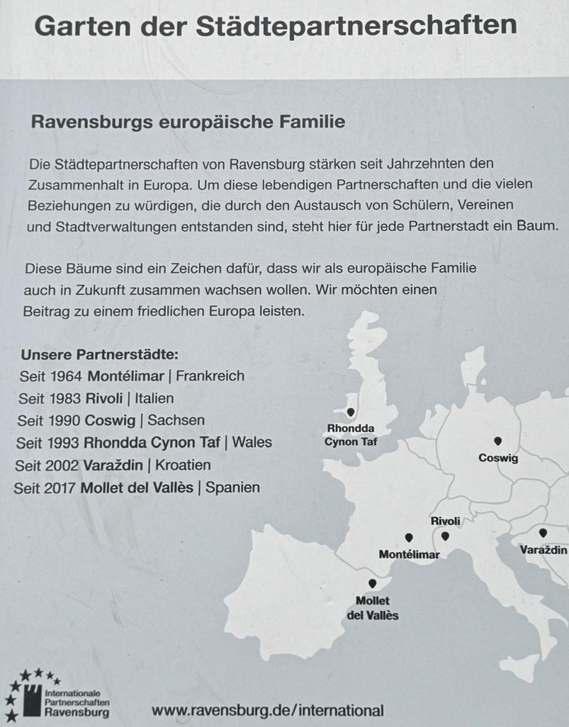 U Ravensburgu, partnerskom gradu Varaždina u Njemačkoj, posađeno je drvo u čast prijateljstvu gradova koji su još 2002. godine potpisali povelju o partnerstvu. Drvo je posađeno u potpuno novom parku uređenom uz rijeku Schussen u kojem jedan dio nosi naziv „Vrt prijateljstva gradova“. Tamo su posađena drva za svaki grad prijatelj Ravensburga, a za Varaždin je izabrana zimzelena crnika (holm oak). Projekt je trajao nekoliko godina, a obuhvatio je cjelovitu transformaciju neuglednog prostora između željezničkog kolodvora i rijeke Schussen. Prostor koji je nekada bio obilježen parkiralištem, zapuštenim površinama, prugom i industrijskim objektima sada je pretvoren u zelenu oazu. Novi park ima prostrane travnjake, drvorede i grmlje, a posjetiteljima nudi mjesto za odmor, dječja igrališta, sportske terene te pivski vrt. Posebno atraktivne su stepenice koje vode do same rijeke Schussen. Stara cesta premještena je uz prugu i pretvorena u biciklističku stazu.