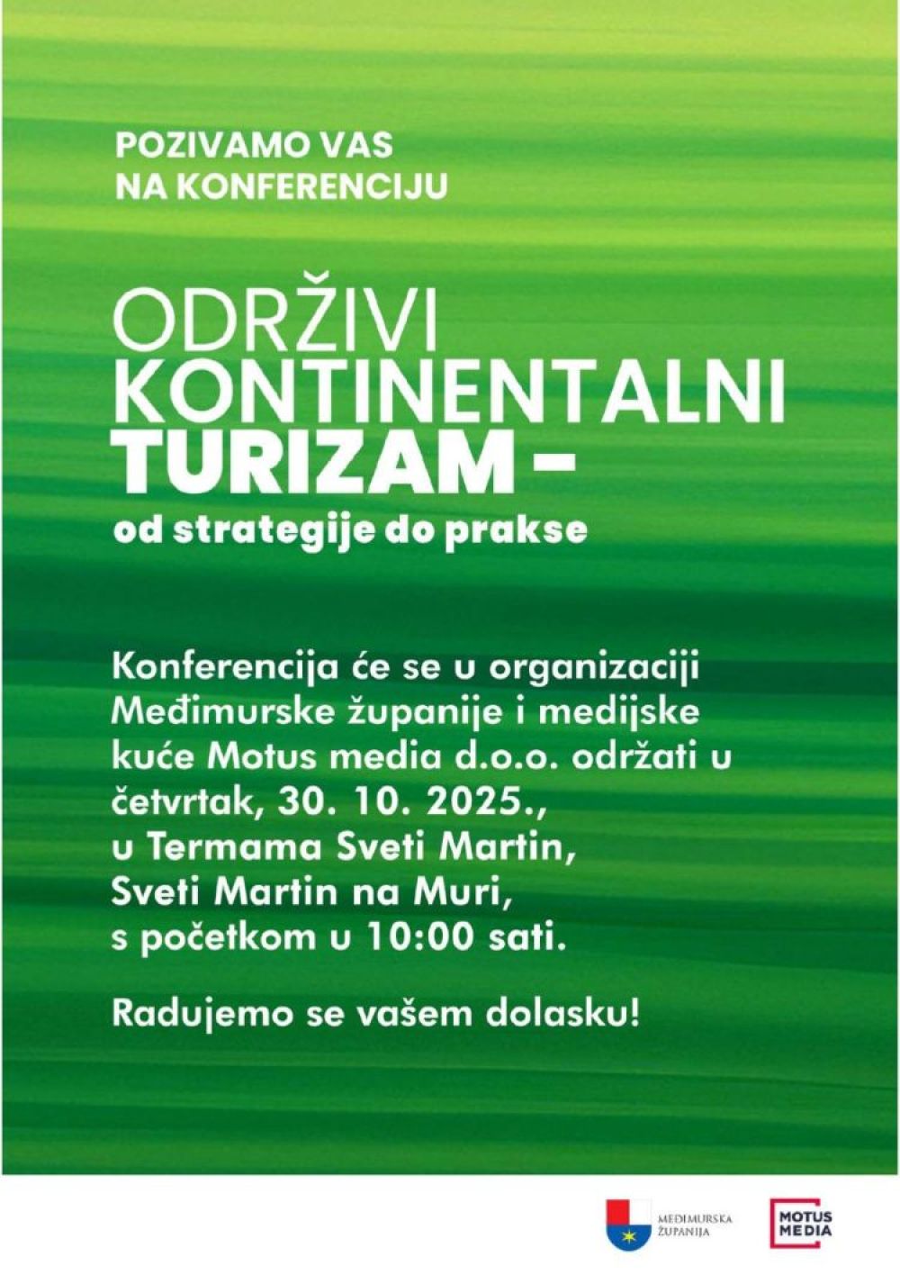 Međimurska županija u suradnji s medijskom kućom Motus Media organizira konferenciju pod nazivom „Održivi kontinentalni turizam – od strategije do prakse“, koja će se održati 30. listopada u Termama Sveti Martin.