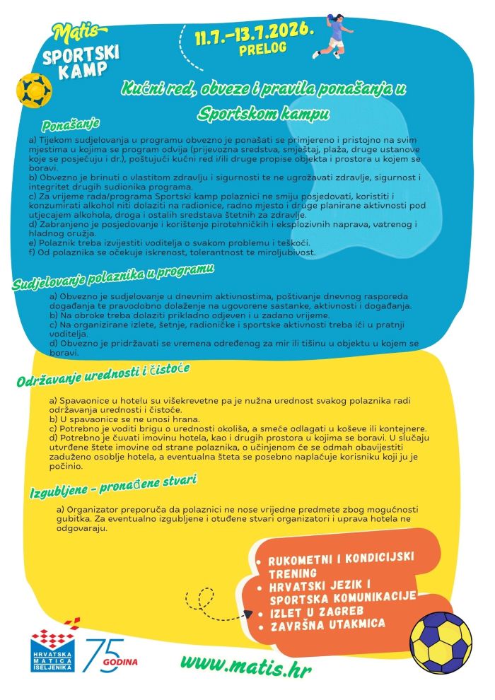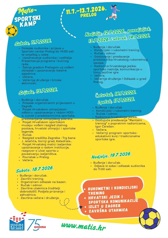 Hrvatska matica iseljenika pokreće novi program usmjeren na povezivanje mladih iz hrvatskog iseljeništva s domovinom. Sportski kamp održat će se od 11. do 19. srpnja 2026. u Prelogu. Riječ je o prvom izdanju programa koji kroz sport, edukaciju i zajedničko iskustvo boravka u Hrvatskoj potiče razvoj vještina, međusobno povezivanje i jačanje osjećaja pripadnosti hrvatskom identitetu. Kamp se organizira u suradnji s Hrvatskim rukometnim savezom. Namijenjen je mladima u dobi od 14 do 18 godina. Program objedinjuje sportske, edukativne i društvene aktivnosti koje doprinose jačanju kulturne i društvene povezanosti hrvatske iseljeničke zajednice s Republikom Hrvatskom.