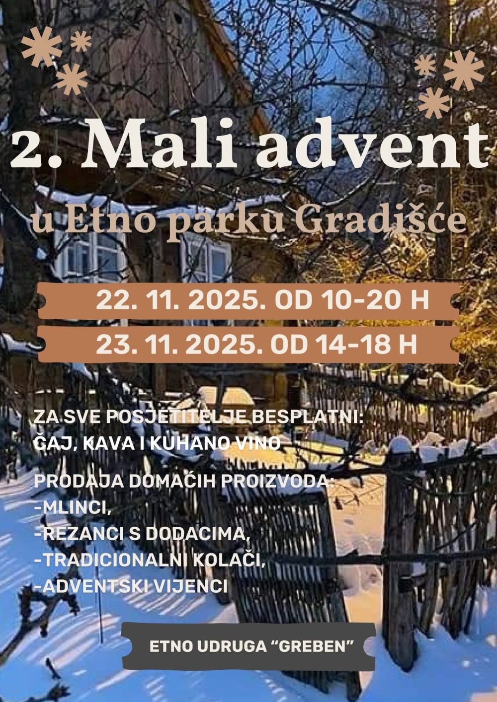 Turistička zajednica grada Novog Marofa poziva vas na Mali Advent u Etno parku Greben uz pravu snježnu idilu nudi i miris domaćih kolača, rezanaca, mlinaca, a i prilika je da nabavite adventski vjenčić. Prošećite, i uživajte u pravom zimskim ugođaju uz bjelinu koja je prekrila brege.
