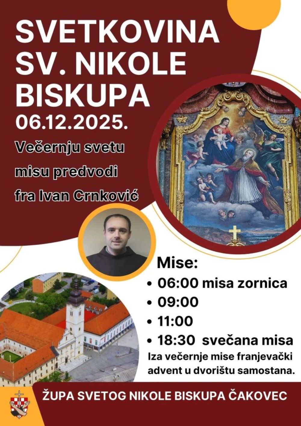Večernju svetu misu u 18:30 sati predvodit će fra Ivan Crnković i samostana u Sl. Brodu. Nakon mise svi ste pozvani na druženje na Adventu u dvorištu samostana uz langošice kuhano vino i čaj! Posjetite i Humanitarnu akcija: “Ukras ponesi, radost donesi” - oko bora, tamo gdje male želje postaju velika radost u 10:30 sati na Franjevačkom trgu, Čakovec.