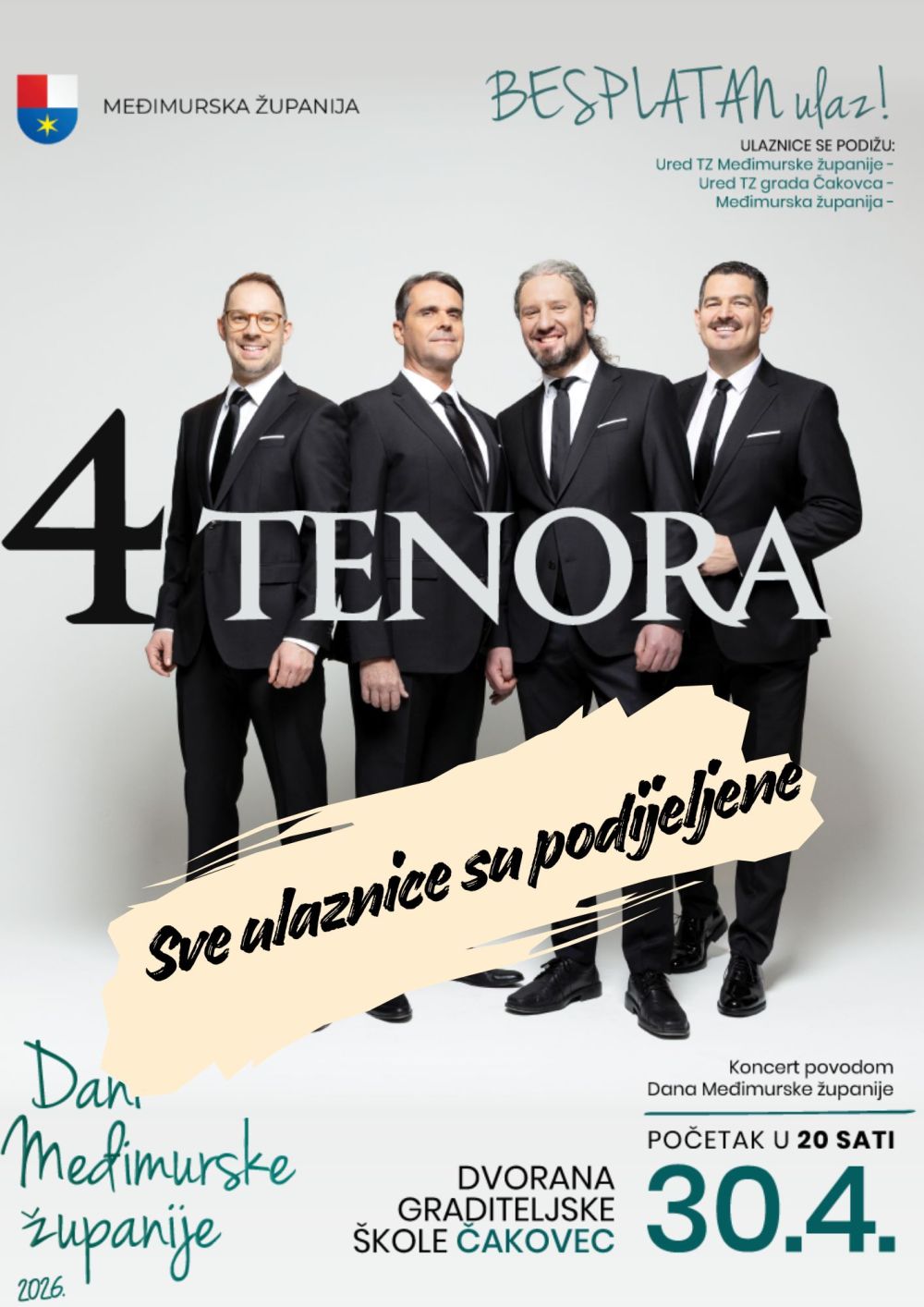 Mrđimurska županija je obavijestilka da su podijeljene su sve ulaznice za koncert 4 tenora i predstavu Aleksandra Lazića. Obavještavamo građane da su sve ulaznice za koncert 4 tenora kao i za predstavu komičara Aleksandra Lazića – podijeljene. Međimurska županija u suradnji s našim ustanovama kulture, udrugama i pojedincima za građane je pripremila iznimno bogat programski sadržaj kojim se slave ovogodišnji Dani Županije.