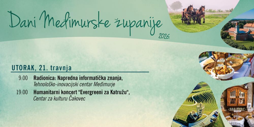 Dani Međimurske županije u utorak, 21. travnja nastavljaju se u Tehnološko-inovacijskom centru Međimurje, gdje će se od 9 sati održati informatička radionica za napredne korisnike. Međimurska zaklada solidarnosti Katruža i Međimurska županija u utorak, 21. travnja organiziraju tradicionalni humanitarni koncert nazvan Evergreeni za Katružu.
