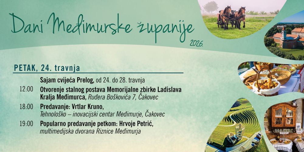 U Čakovcu se ponovo otvara stalni postav Memorijalne zbirke Ladislava Kralja Međimurca, najznačajnijeg međimurskog slikara. Zbirka je bila privremeno zatvorena za posjetitelje zbog velikog projekta energetske obnove Kraljeve kuće. Otvorenje stalnog postava Memorijalne zbirke Ladislava (Ul. Ruđera Boškovića 7, Čakovec) održat će se u 12 sati. Program Dana Međimurske županije nastavlja se od 18 sati u Tehnološko-inovacijskom centru Međimurje gdje će se održati predavanje Vrtlar Kruno.