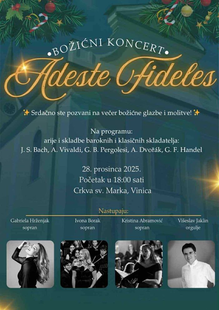 Uz Gabrielu, publici će se predstaviti i njezine kolegice i studentice s akademije – Kristina Abramović (sopran) i Ivona Borak (sopran), uz orguljašku pratnju Višeslava Jaklina. Program donosi izbor arija i djela baroknih i klasičnih skladatelja poput J. S. Bacha, A. Vivaldija, G. B. Pergolesija, A. Dvořáka i G. F. Handela, kao i hrvatske tradicionalne božićne pjesme koje će dodatno naglasiti blagdanski ugođaj. Ulaz slobodan – svi su dobrodošli!