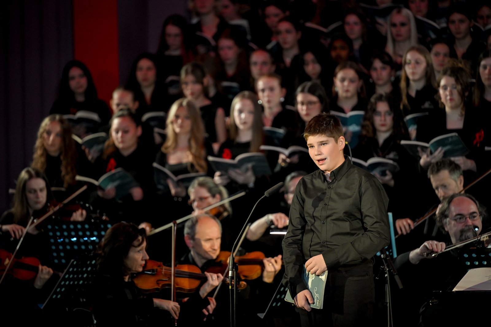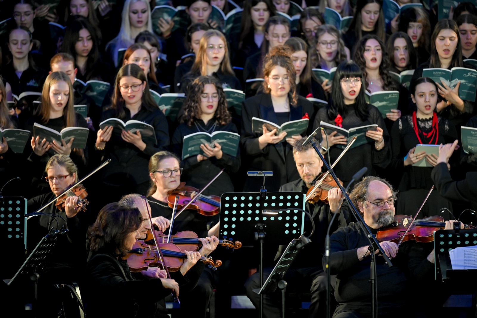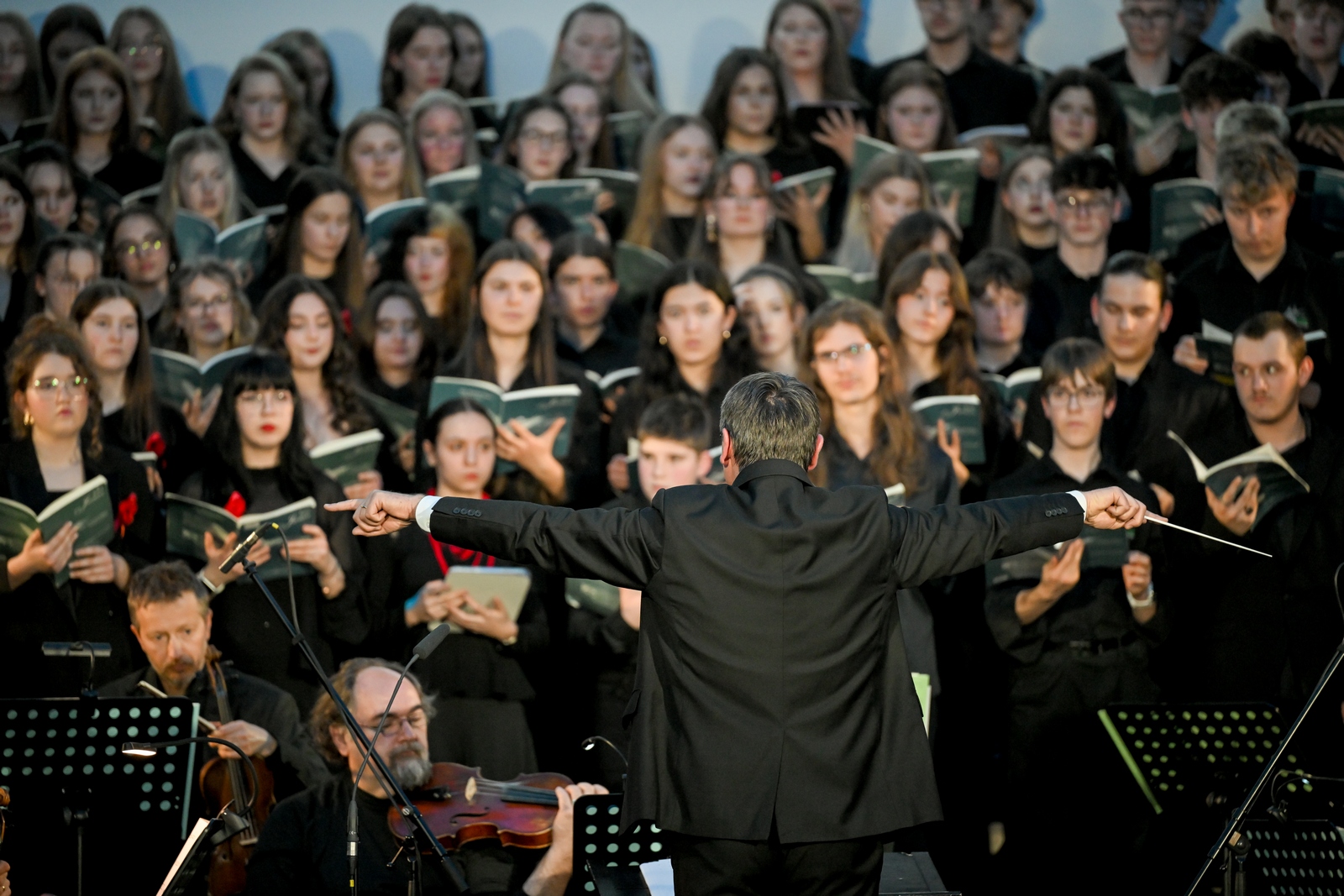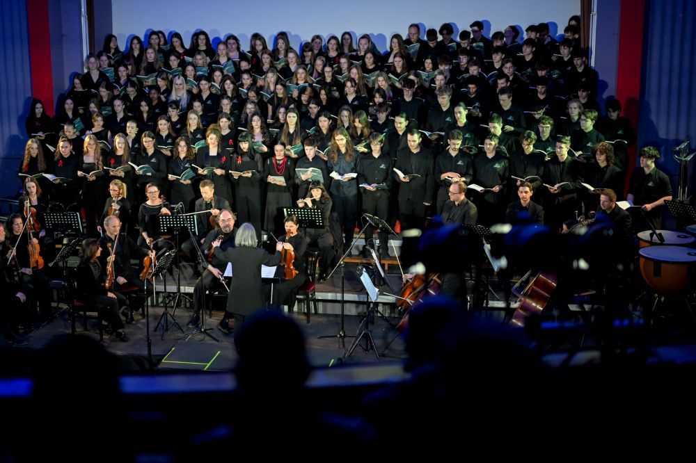 Na pozornici je nastupilo čak 140 članova združenog zbora učenika Glazbene škole u Varaždinu i švicarske Kantonsschule Schaffhausen, uz Varaždinski komorni orkestar, stvarajući monumentalnu zvučnu sliku kakvu zahtijeva ovo jedno od najizvođenijih suvremenih zborsko-orkestralnih djela u svijetu. Izvedbom su ravnali dirigentica Dada Ruža i dirigent Ulrich Waldvogel Herzig, koji su s mladim glazbenicima mjesecima pripremali ovu zahtjevnu partituru.