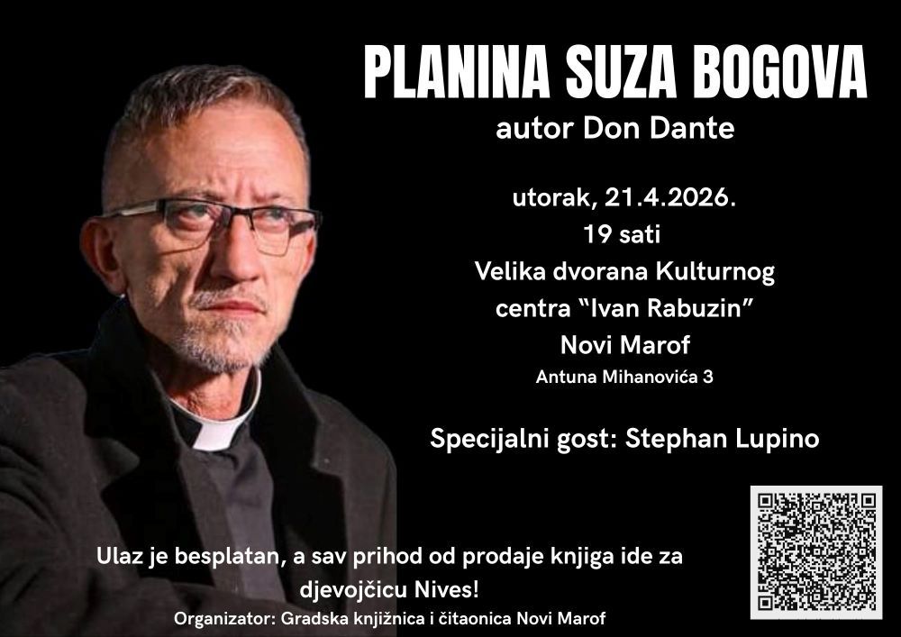 U utorak, 21. travnja s početkom u 19 sati, u velikoj dvorani Kulturnog centra „Ivan Rabuzin“ u Novom Marofu održat će se predstavljanje knjige „Planina suza bogova“ autora Don Dantea, odnosno velečasnog Željka Lovrića.
