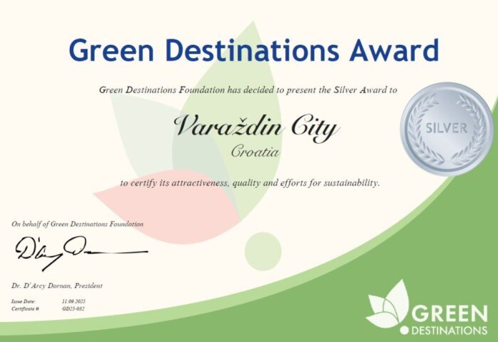 Na konferenciji Green Destinations Global Conference u Montpellieru u Francuskoj, Gradu Varaždinu je na svečanosti u ponedjeljak, 29. rujna 2025 uručena srebrna nagrada (Silver Award) za održivost. Dodjelom nagrade Varaždin se svrstao među međunarodno prepoznata “zelena odredišta”, kao grad koji svoju budućnost gradi u skladu s načelima održivog razvoja i standardima programa Green Destinations. Nagradu je preuzela Dorotea Solomun, koordinatorica za održivi razvoj turističke destinacije grada Varaždina.